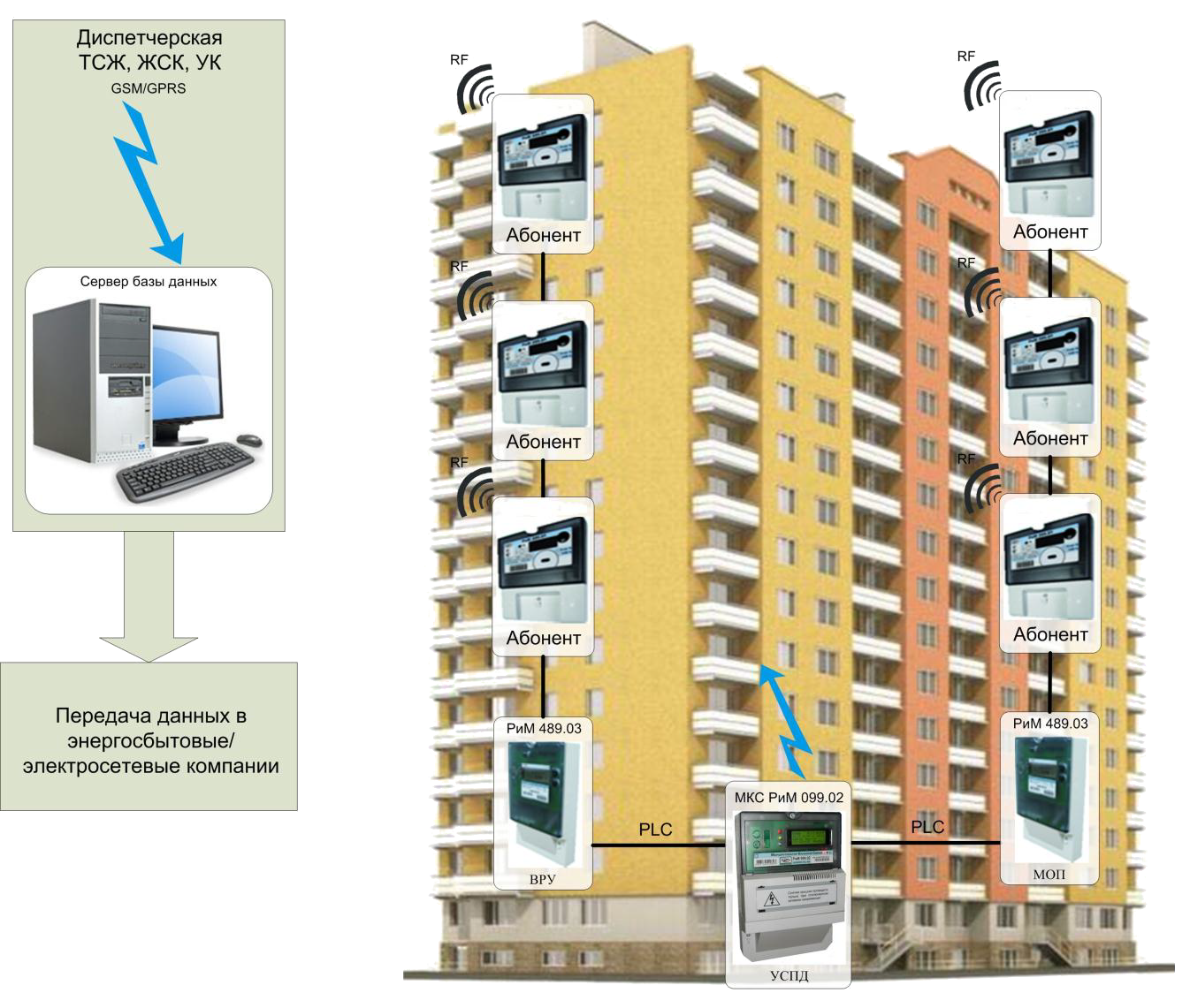 - Данные с показаниями абонентских электросчетчиков собираются маршрутизатором каналов связи по PLC (электросети)/RF (радиоканалу);